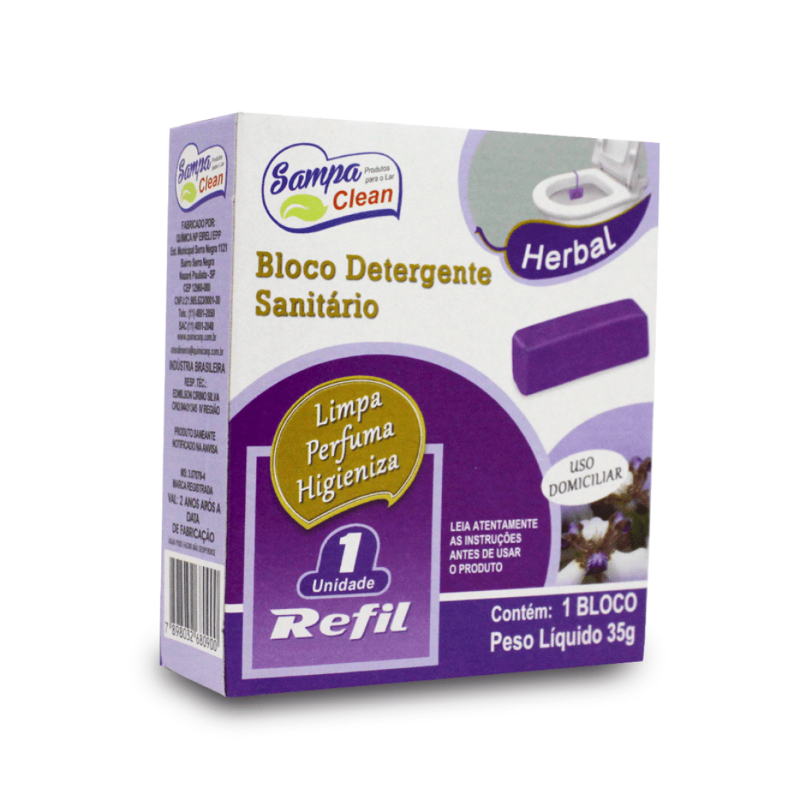 BLOCO SANITÁRIO SUPORTE+REFIL Bloco Detergente Sanitário Sampa Clean limpa, higieniza o vaso sanitário e ainda deixa um agradável perfume. Ele tem a haste da cestinha com regulagem de altura, assim pode ser usado em diversos tipos de vasos sanitários, é só regular de acordo com a altura do seu vaso, encaixar na borda do vaso de forma que a mesma fique na parte interna atingida pelo maior fluxo de água durante a descarga. Essa embalagem contém 1 bloco sanitário e um aparelho Peso liquido 35g.